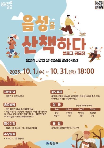 이번 공모는 ‘음성을 산책하다’를 주제로 진행되며, 음성군의 산책로, 저수지, 자전거길, 드라이브하기 좋은 곳 등 가을을 맞아 자연과 어우러진 산책 명소에 대해 블로그에 후기를 작성하면 된다. 지역, 나이 제한 없이 누구나 참여 가능하며 1인당 2작품까지 지원 가능하지만 중복 수상은 불가하다.