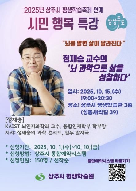 한방통신사 신유철기자 기자 | 상주시 평생학습원은 2025. 10. 15. 오후 7시부터 8시30분까지 상주시 평생학습관 3층 강당에서 뇌과학자이자 미래학자인 정재승 KAIST 교수를 초청하여 특별 강연을 진행한다.