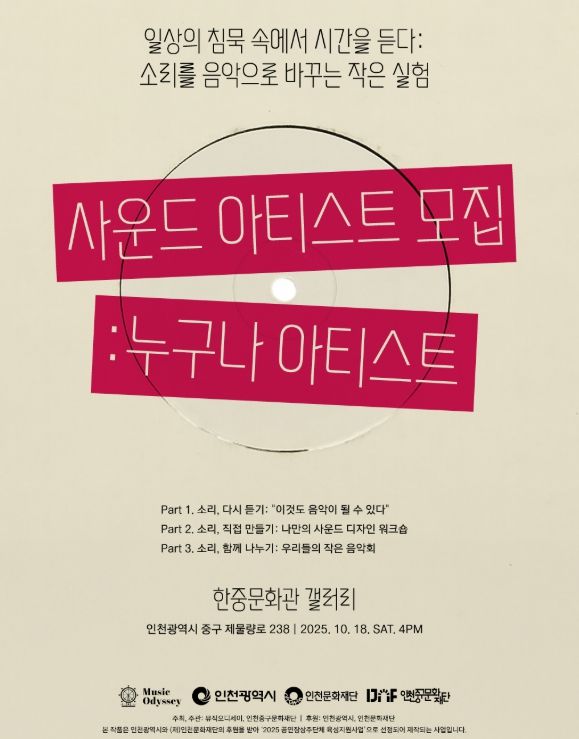 한방통신사 신유철기자 기자 | (재)인천중구문화재단은 상주단체 ‘뮤직오디세이’의 시민참여 퍼블릭프로그램 〈일상의 침묵 속에서 시간을 듣다'에 함께할 참가자를 선착순 모집한다고 1일 밝혔다.