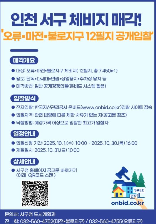 한방통신사 신유철기자 기자 | 인천 서구는 오는 10월 1일부터 30일까지 오류, 마전, 불로지구 토지구획정리사업구역 내 체비지 12필지를 일반 공개경쟁 입찰(전자입찰) 방식으로 매각한다고 밝혔다.