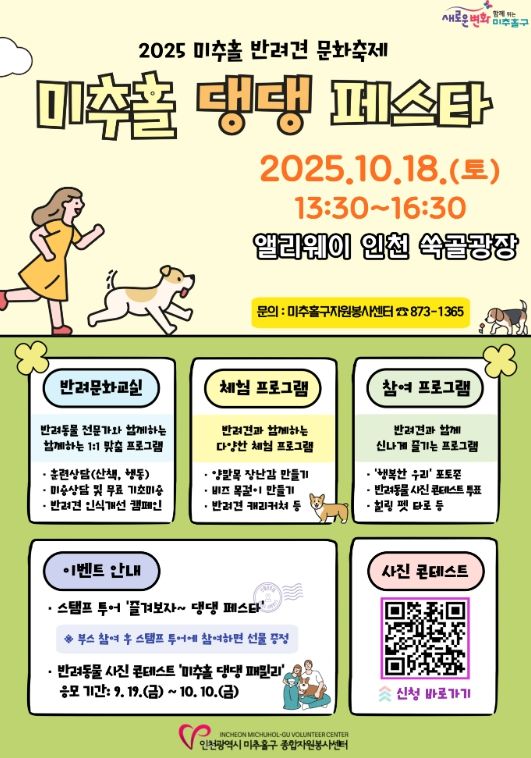 한방통신사 신유철기자 기자 | 인천 미추홀구종합자원봉사센터는 오는 10월 18일 앨리웨이 인천 쑥골광장에서 ‘2025년 미추홀 반려견 문화축제 미추홀 댕댕 페스타’를 개최한다.