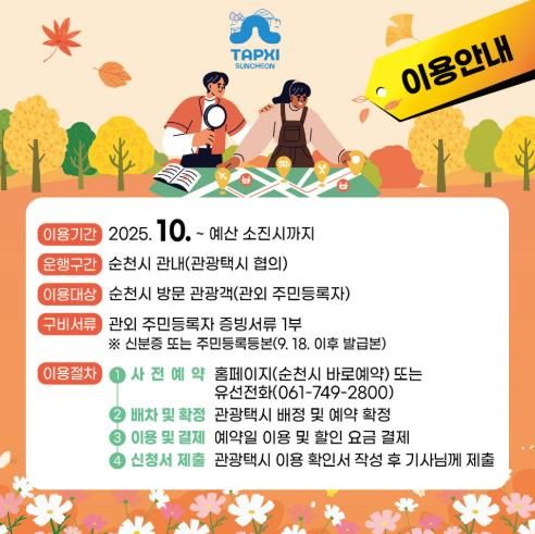한방통신사 신다은기자 기자 | 순천시는 10월부터 순천 관광택시 ‘가을맞이 반값 할인 이벤트’를 진행한다고 밝혔다.