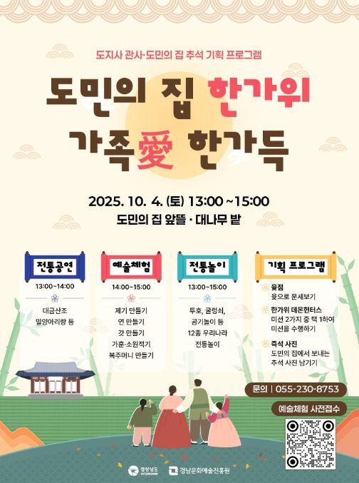한방통신사 신유철기자 기자 | 경상남도는 10월 4일 오후 1시부터 3시까지 도심 속 복합문화공간 활성화를 위해 추석을 맞아 귀향객과 도민이 함께 즐길 수 있는 기획 프로그램 ‘도민의 집 한가위, 가족愛 한가득’을 개최한다고 밝혔다.