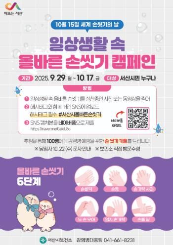 아울러 서산 시민들을 대상으로 일상생활 속 올바른 손씻기 실천 SNS 참여 이벤트도 진행해, 각 가정에서 손씻기 실천 모습을 SNS에 공유해 참여할 수 있도록 했다.