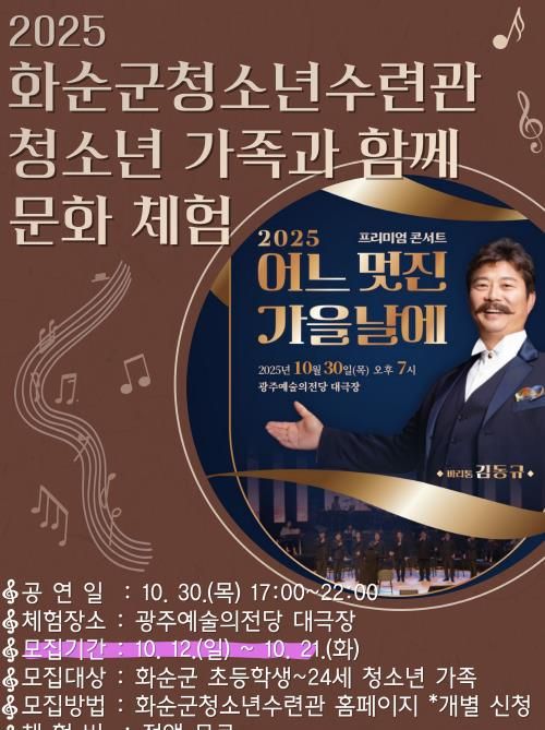 한방통신사 신다은기자 기자 | 화순군은 2일 청소년수련관에서 짙어가는 가을의 정취 속에 청소년과 가족이 함께하는 특별한 문화체험, 바리톤 김동규의 프리미엄 콘서트'어느 멋진 가을날'을 관람할 청소년 가족 60명을 선착순 모집한다고 밝혔다.