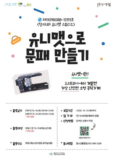 한방통신사 신유철기자 기자 | 부평구 청소년수련관은 오는 14일까지 부평 내 14~16세 청소년을 대상으로 ‘창의 UP! 유니맷 스튜디오!’ 참가자를 모집한다.