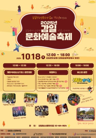 한방통신사 신유철기자 기자 | 하남시 감일청소년문화의집은 오는 10월 18일 오후 12시부터 18시까지 감일문화공원(감일공공복합청사 뒷편)에서 '제2회 감일문화예술축제'를 개최한다.