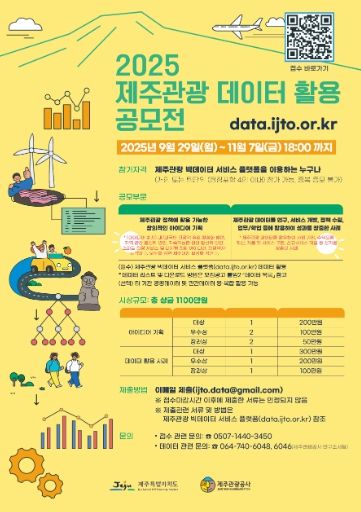 한방통신사 신유철기자 기자 | 제주특별자치도와 제주관광공사는 오는 11월 7일까지 온라인 채널을 통해 ‘2025년 제주관광 데이터 활용 공모전’ 참가자를 모집하고 있다고 2일 밝혔다.