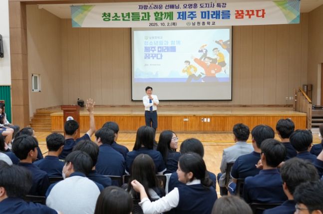 한방통신사 신유철기자 기자 | 오영훈 제주특별자치도지사는 2일 남원중학교(교장 오경석)를 찾아 전교생을 대상으로 특별강연을 열고, “남원과 제주를 넘어 아시아, 나아가 우주까지 여러분의 무대가 돼야 한다”며 청소년들의 꿈과 도전을 격려했다.