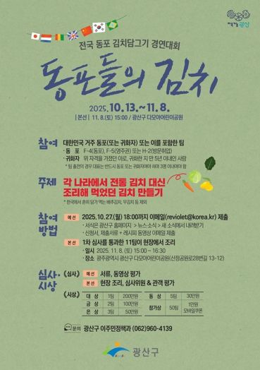 한방통신사 김성의 기자 | 광주 광산구가 13일부터 11월 18일까지 전국 곳곳에 거주하고 있는 동포들을 대상으로 ‘전국 동포 김치담그기 경연대회_동포들의 김치’를 개최한다.