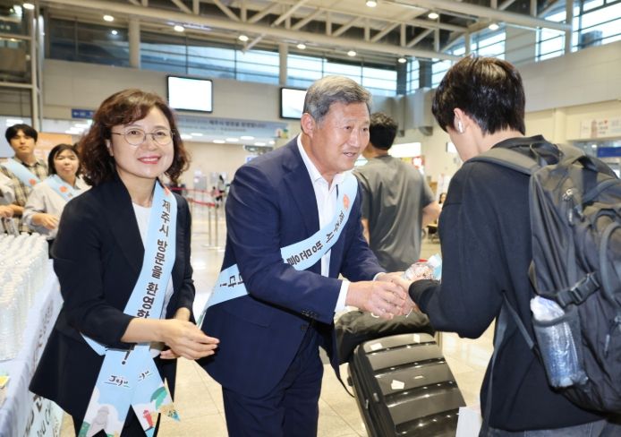 이날 김 시장은 장시간 승선으로 지친 방문객에게 시원한 삼다수를 전달하며 따뜻한 명절 분위기를 조성했고, 제주관광지도와 성안올레지도 등 각종 관광정보를 제공하며 일일이 환영 인사를 전했다.