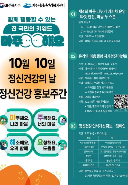 한방통신사 신다은기자 기자 | 여수시는 정신건강의 날(10월 10일)을 기념해 10월 10일부터 24일까지 ‘2025년 정신건강 홍보주간’을 운영한다.
