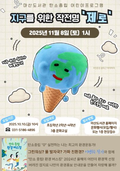 한방통신사 신유철기자 기자 | 김포시 마산도서관에서 오는 11월 8일 오후 1시부터 3시까지, 초등학교 2학년~4학년 어린이를 대상으로 탄소중립 어린이 프로그램 책풍당당 '지구를 위한 작전명 ‘제로’'를 운영한다.