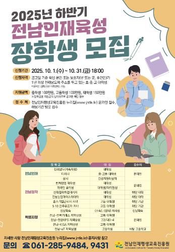 한방통신사 신다은기자 기자 | 전라남도와 전남인재평생교육진흥원은 실질적인 교육기회 보장과 미래인재로의 성장, 지역 정착을 지원하기 위한 2025년 하반기 전남인재육성 장학생을 오는 31일까지 모집한다.