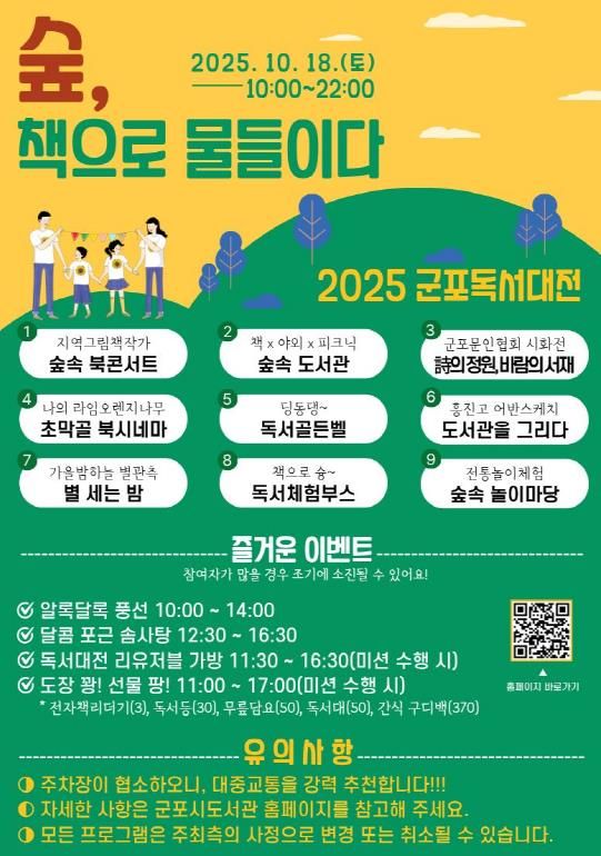 하은호 군포시장은 “2025 군포독서대전은 단순한 책 축제가 아니라 시민이 책과 자연 속에서 교감하며 휴식과 영감을 얻는 문화의 장이 될 것”이라며 “책 읽는 도시 군포의 정체성을 강화하고 시민의 문화적 자긍심을 높이는 대표 축제로 발전시켜 나가겠다”고 밝혔다.