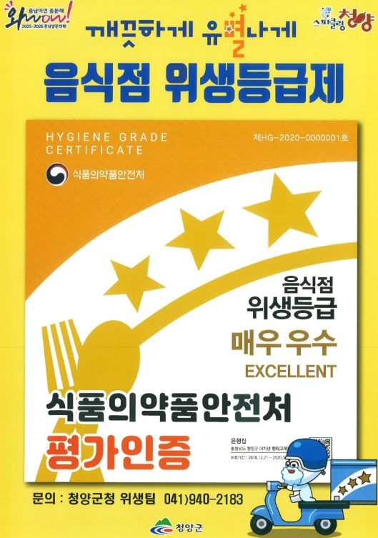 위생등급제 신청은 식품안전나라 온라인 접수 또는 청양군청 행복민원과 위생팀 방문 접수로 가능하다.