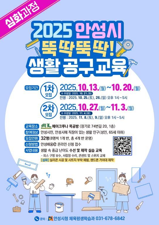 안성시 관계자는 “누구나 참여할 수 있는 과정이지만, 난이도를 높여 실제 생활에서 자주 접하는 문제를 해결할 수 있는 기술 습득에 중점을 두었다”며, “시민들의 생활 자립 역량을 한층 강화하는 기회가 될 것”이라고 말했다.
