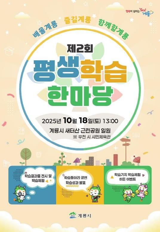 한방통신사 신태공 기자 | 계룡시는 오는 18일 오후 1시부터 시청 앞 새터산 근린공원에서 시민이 주도하는 배움의 축제 “2025 제2회 계룡시 평생학습 한마당”을 개최한다고 밝혔다.