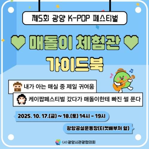 한방통신사 신다은기자 기자 | 광양시는 ‘제5회 광양 K-POP 페스티벌’의 사전 열기를 확산하고 시민과 관광객이 함께 만들어가는 지속가능한 축제문화를 조성하기 위해 ‘매돌이 체험관’ 운영 및 ‘기대평 이벤트’를 추진한다고 밝혔다.