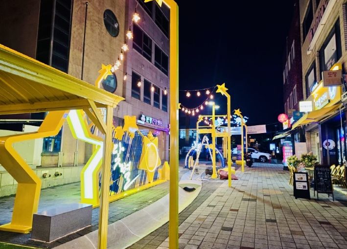 한방통신사 신유철기자 기자 | 문경시는 점촌원도심상권 130m 구간에 노란색 간판과 어닝을 새로 달고, 상징 조형물 13점, 조형벤치 20개를 설치했으며, 은하수 조명 18m와 360여 개의 파티등으로 ‘닻별 테마길’을 화려하게 완공했다.