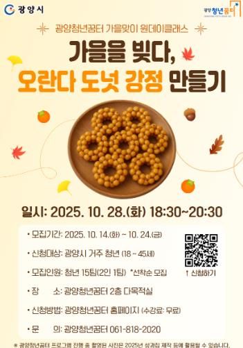 한방통신사 신다은기자 기자 | 광양시는 청년들의 여가문화 활성화와 정서적 힐링을 위한 프로그램의 일환으로, 광양청년꿈터에서 가을맞이 원데이클래스 ‘가을을 빚다 – 오란다 도넛 강정 만들기’ 참가자를 모집한다고 14일 밝혔다.