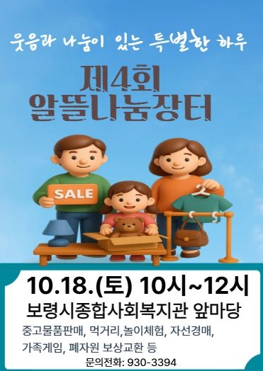 한방통신사 신태공 기자 | 보령시종합사회복지관은 오는 10월 18일 오전 10시부터 12시까지 복지관 앞마당에서 ‘제4회 알뜰나눔장터’를 개최한다.