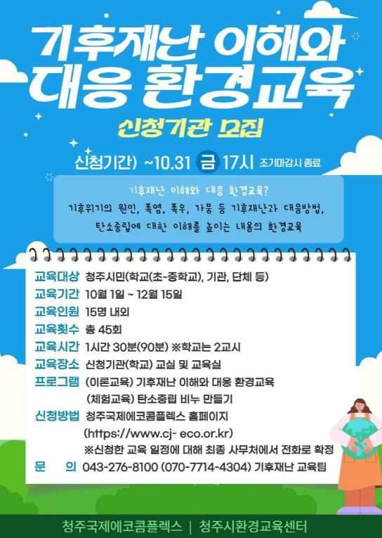 청주국제에코콤플렉스 관계자는 “기후위기 시대에 기후재난 대응 능력은 모두에게 필수적인 소양”이라며 “이번 환경교육을 통해 시민들이 기후 위기를 정확히 이해하고, 실천적인 행동을 통해 안전하고 지속가능한 미래를 만들어 나아가기를 기대한다”고 밝혔다.