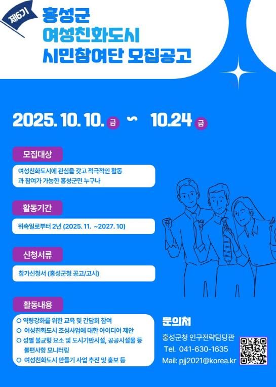 모집 기간은 오는 24일까지이며, 홍성군에 거주하는 군민 중 양성평등과 여성친화도시에 관심 있는 사람이라면 누구나 지원할 수 있다. 모집 인원은 20명 내외로, 공개 모집을 통해 선정된다.