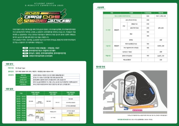 출전 차량은 10kW 이하 전기모터를 장착한 초소형 전기차급 모빌리티로, 성능검사·가속·슬라럼·내구레이싱 등 기술력과 주행성능을 종합 평가하는 경기로 진행된다.