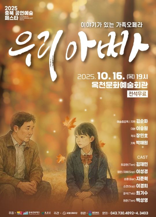 이번 공연은 충북문화재단과 옥천군이 주최하고 씨엘오페라단이 주관하며 충청북도가 후원하는 가족형 창작 오페라로 사고로 아내를 잃은 가장‘정수’의 이야기를 중심으로 가족 간 소통과 아버지의 희생, 사랑을 따뜻하게 그려낸다.