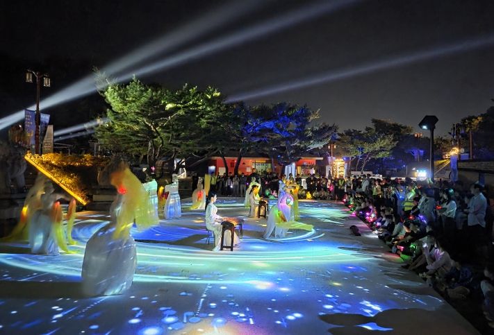 ‘대가야, 열두개의 별’이라는 주제로 대가야 악성 우륵 선생이 작곡한 가야금 12곡과 지산동 고분군에 담긴 대가야의 영광을 미디어아트로 재해석하여 유산의 가치와 신비로운 분위기를 담아내었다. 각각의 콘텐츠는 가야금 선율과 함께 어우러지며, 특히 무희들의 전통무용과 가야금 연주가 미디어아트의 하이라이트를 장식했다.