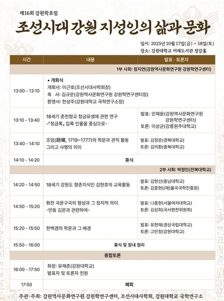 한방통신사 신유철기자 기자 | 강원역사문화연구원 강원학연구센터는 2025년 10월 17일 오후 1시, 강원대학교 미래도서관 정강홀에서 제16회 강원학포럼 ‘조선시대 강원 지성인의 삶과 문화’를 조선시대사학회·강원대학교 국학연구소와 공동으로 개최한다.
