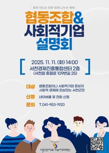 한방통신사 신태공 기자 | (재)서천군지속가능지역재단은 오는 10월 20일 오후 2시, 서천경제진흥통합센터에서 ‘협동조합·사회적기업 설명회’를 연다.