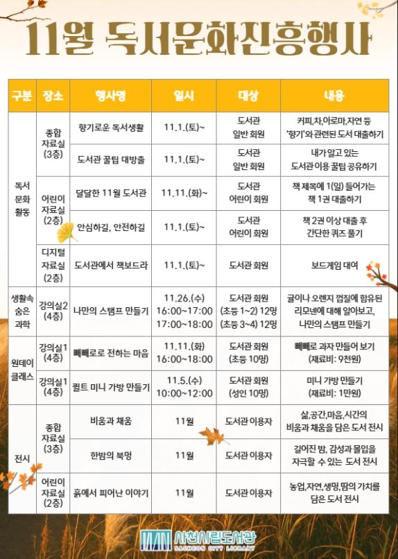 한방통신사 신유철기자 기자 | 사천시는 사천시립도서관에서 11월 한 달 동안 책과 함께 여유로운 시간을 보내며 감성을 채울 수 있는 다양한 독서문화행사와 체험 프로그램을 운영한다고 17일 밝혔다.