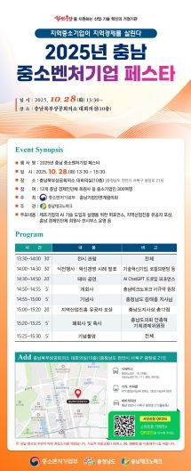 한방통신사 신유철기자 기자 | (재)충남테크노파크(원장 서규석)는 도내 중소벤처기업의 혁신 성장과 상생 네트워크 강화를 위해 '2025 충남 중소벤처기업 페스타'를 28일 충남북부상공회의소 10층 대회의실에서 개최한다고 밝혔다.