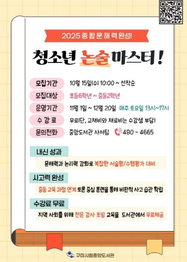 한방통신사 신유철기자 기자 | 구미시립중앙도서관은 청소년들의 기초 문해력과 논리적 사고력 향상을 위해 마련한 논술특별프로그램 ‘청소년 논술마스터’ 수강생을 시립중앙도서관 누리집에서 선착순으로 모집하고 있다.