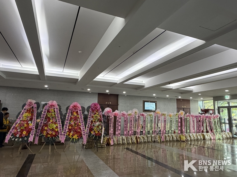이날 행사장에는 축하화환 대신 쌀화환이 가득 채워져 눈길을 끌었다.