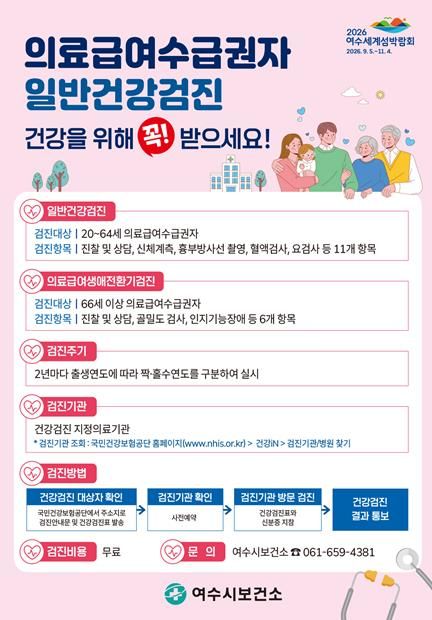 한방통신사 신다은기자 기자 | 여수시는 의료취약계층의 질환을 조기에 발견하고 시민 건강을 증진하기 위해 의료급여수급권자의 일반건강검진 수검을 적극 독려하고 있다.