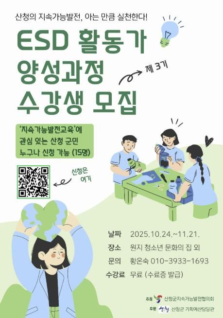 한방통신사 신유철기자 기자 | 산청군지속가능발전협의회는 24일 ‘ESD(지속가능발전교육) 활동가 양성과정 제3기’ 운영에 돌입했다고 밝혔다.