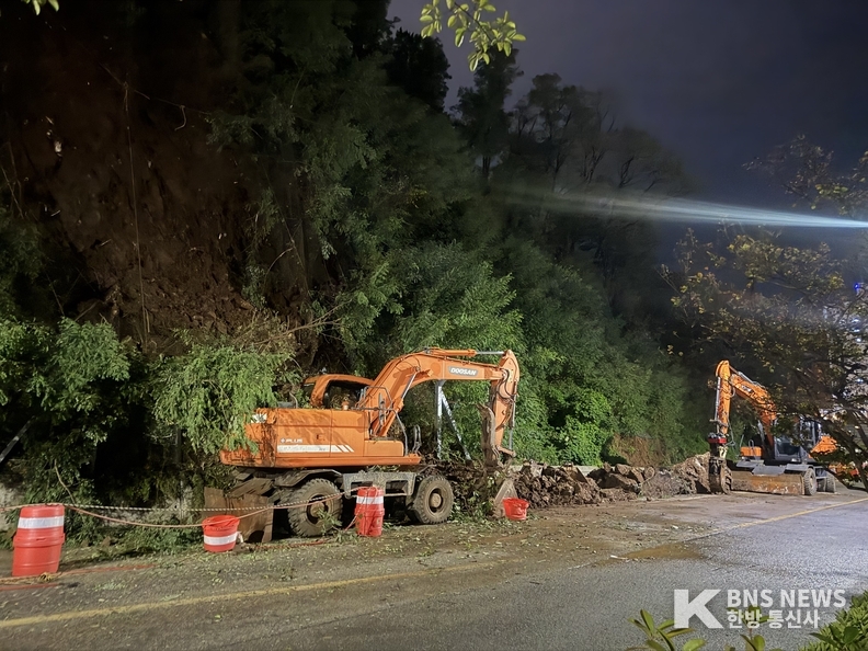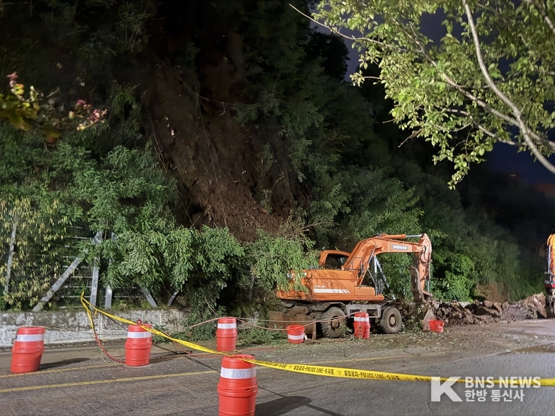본지 취재진이 10월 24일 저녁 현장을 확인한 결과, 도로 한편은 “낙석위험 – 출입을 통제합니다”라는 안내 표지와 함께 삼척시청 안전관리과 명의의 통제선이 설치되어 있었고, 양쪽에는 굴착기(포크레인) 2대가 투입돼 토사 제거 작업을 진행하다가 멈춰있는 상태였다.