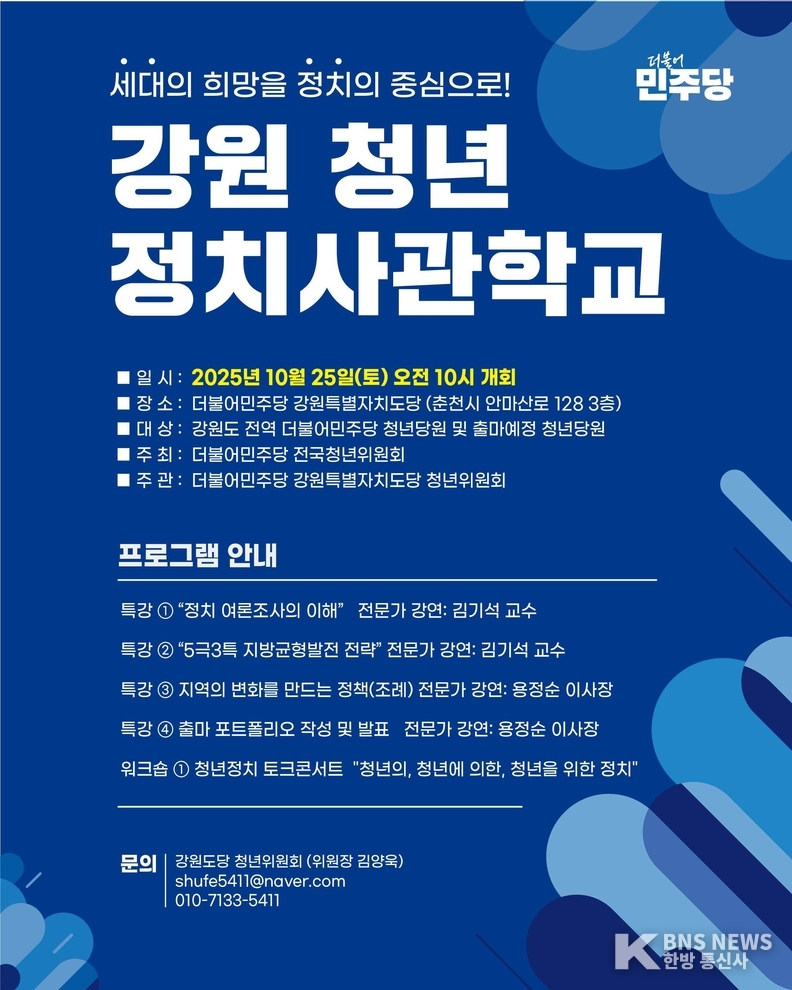 ‘강원 청년정치사관학교’는 더불어민주당 중앙당 전국청년위원회 공모사업으로 선정돼, 강원특별자치도당 청년위원회가 기획한 청년 주도 정치교육 프로그램이다.