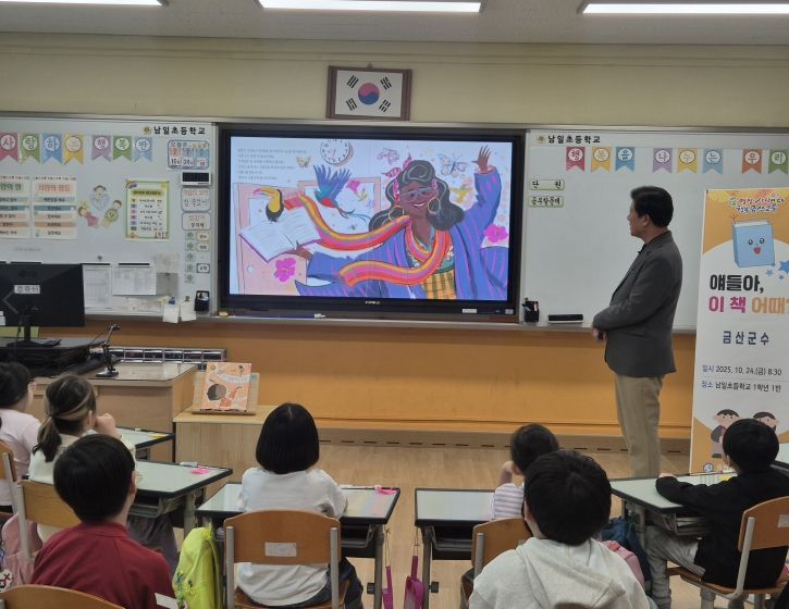한방통신사 신태공 기자 | 박범인 금산군수는 지난 24일 남일초를 방문해 학생들과 함께 그림책 읽는 시간을 가졌다.