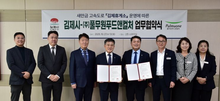 한방통신사 김성의 기자 | 김제시는 27일 ㈜풀무원푸드앤컬처와 '새만금전주간' 고속도로 개통에 따라 새롭게 조성되는‘김제휴게소’운영에 따른 업무협약을 체결했다고 밝혔다.