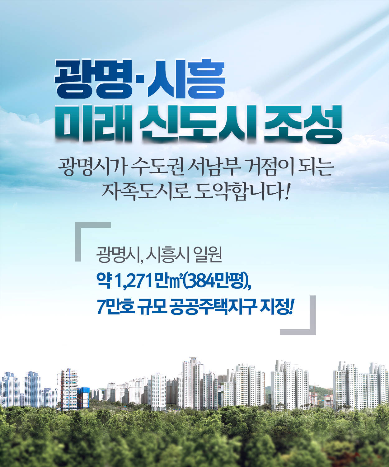 광명시흥신도시에는 여의도 면적의 1.3배에 달하는 공원과 녹지를 확보하고 보건·방재·안전 기반 시설을 설치해 주거, 교육, 일자리, 문화가 어우러진 스마트 명품도시, 친환경 녹색도시로 조성된다.