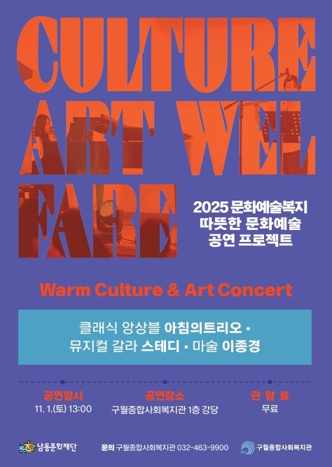 한방통신사 신유철기자 기자 | 인천시 남동구 남동문화재단은 구월종합사회복지관과 협력해 오는 11월 1일 오후 1시부터 구월종합사회복지관 1층 강당에서 가족 특화 문화예술복지 공연을 운영한다고 30일 밝혔다.