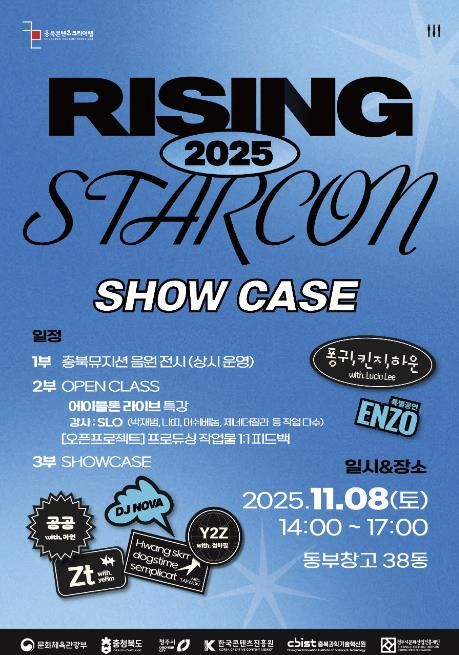 2025 라이징스타콘 결과발표회는 누구나 무료로 참여할 수 있으며, 충북콘텐츠코리아랩 누리집을 통한 사전 신청 또는 당일 현장 접수로도 함께할 수 있다.