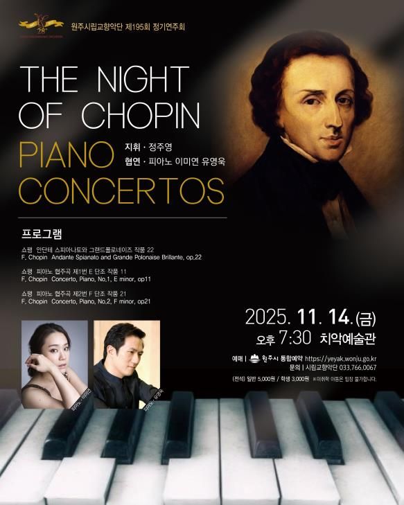 한방통신사 양호선기자 기자 | 원주시립교향악단은 오는 14일 오후 7시 30분, 치악예술관에서 제195회 정기연주회 ‘The Night of CHOPIN’을 개최한다.