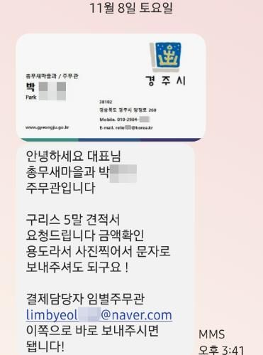 그는 한 지역 업체에 “경주시청에서 물품 구매를 진행하고 있다”며 문자메시지를 보내 견적서와 거래를 요청한 것으로 확인됐다.