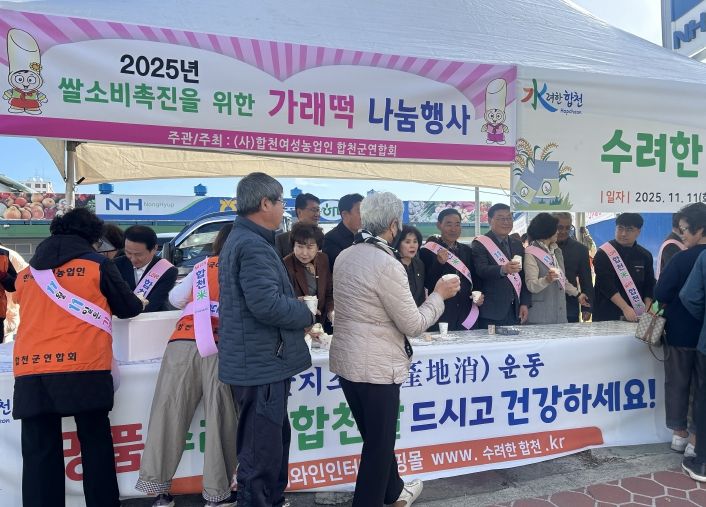 한방통신사 신유철기자 기자 | 합천군은 11일 합천농협 하나로마트 앞에서 (사)한국여성농업인합천군연합회(회장 조임이)가 주관·주최하는 ‘합천쌀 소비 촉진을 위한 가래떡 나눔행사’를 열었다.