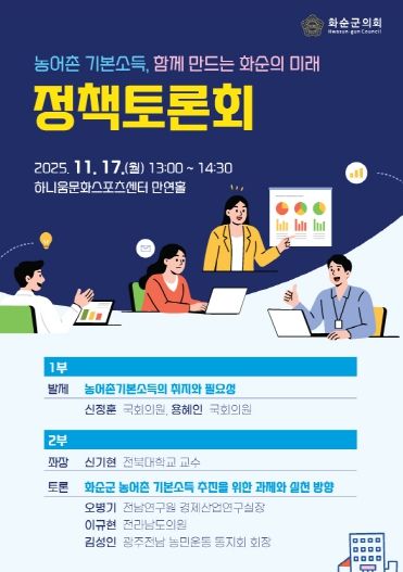 한방통신사 신다은기자 기자 | 화순군의회는 오는 11월 17일 오후 1시, 하니움문화스포츠센터 만연홀에서 ‘농어촌 기본소득, 함께 만드는 화순의 미래’를 주제로 농어촌 기본소득 정책토론회를 개최한다.